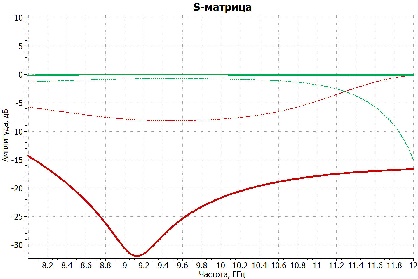 После запуска оптимизационного анализа были получены новые графики параметров, которые соответствуют поставленной цели оптимизации конструкции. На приведенной ниже иллюстрации можно сравнить графики параметров S11 (красные линии) и S21 (зеленые линии) до оптимизации (обозначены пунктиром) и после (сплошные линии):