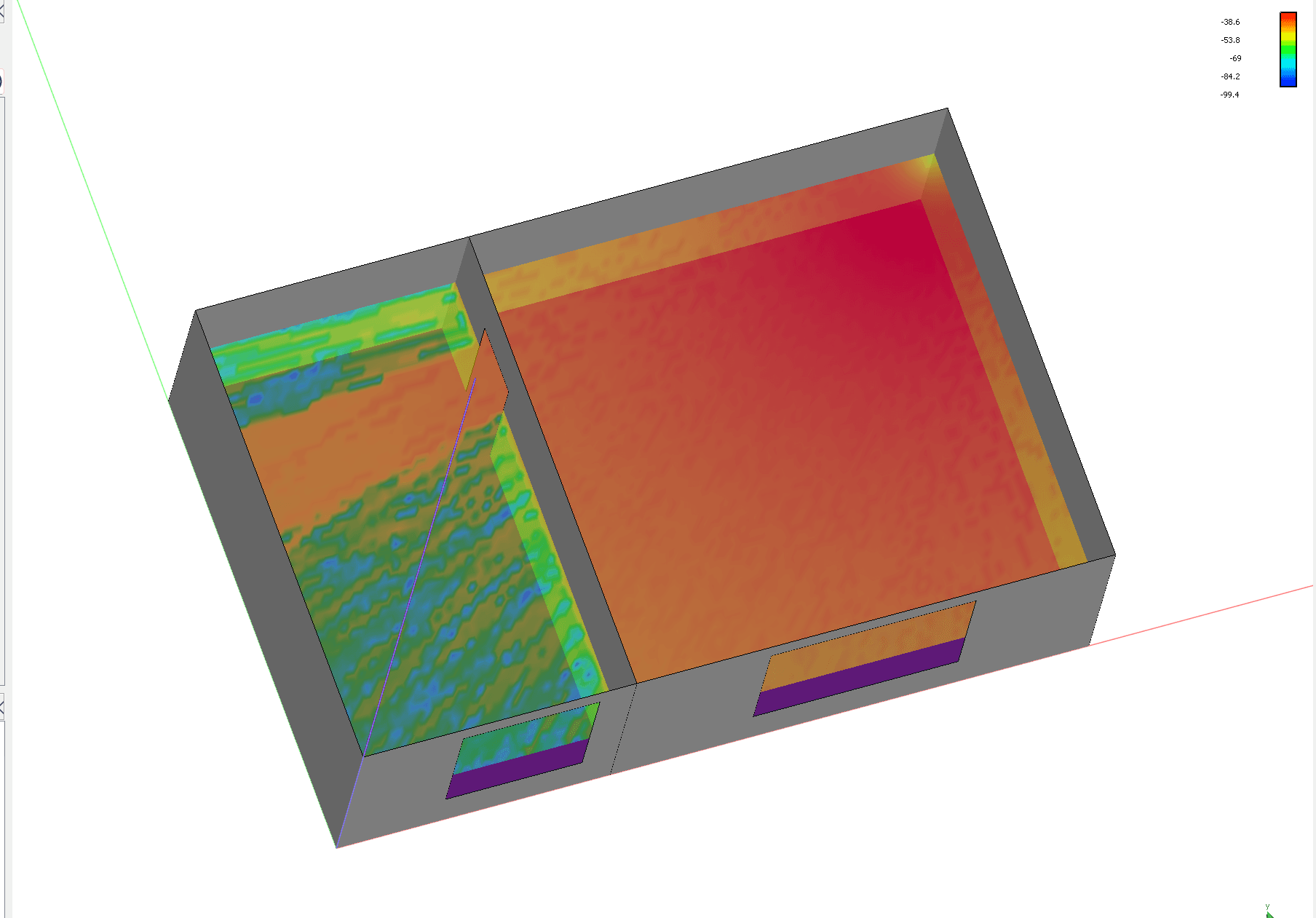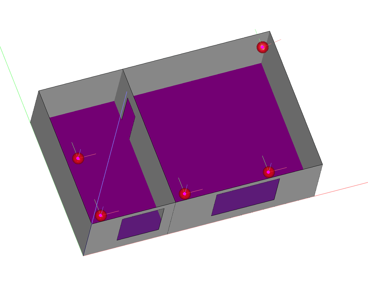 В САПР «ГАММА» в области 3D-проектирования было воссоздано помещение с учетом материалов стен, окон, пола и потолка. Добавлен передатчик (Wi-Fi роутер) и созданы приемники.