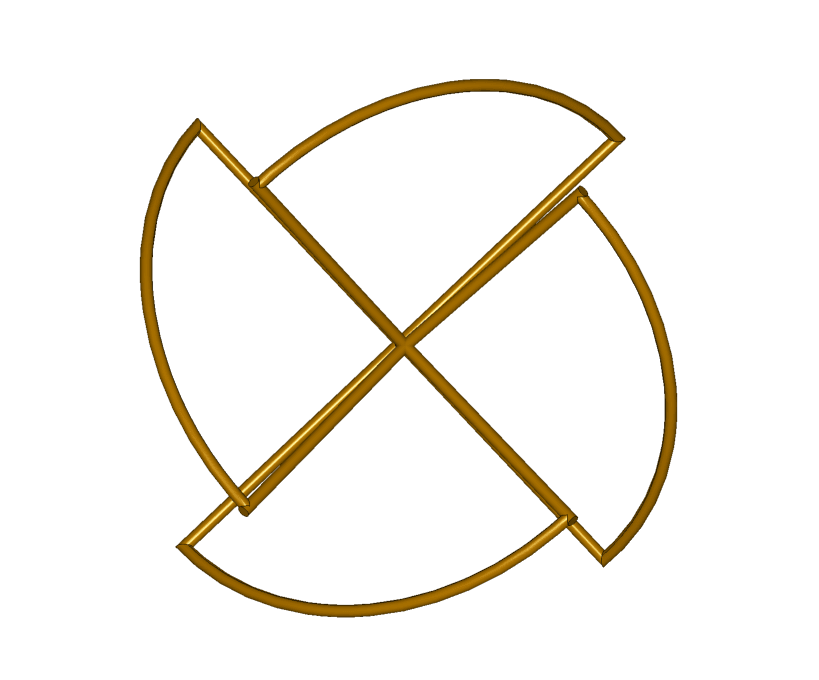 Модель антенны «Клевер», которая используется в этом примере, представляет собой четыре соединённых друг с другом «лепестка», в месте соединения которых подключается источник питания одним полюсом на наклонные отрезки, а другим на горизонтальные. Длина отрезков равняется λ/4, а дуги λ/2, тем самым полная длина элементов лепестка равняется длине волны λ. Расстояние от точки питания до каждой точки дуги равняется λ/4.