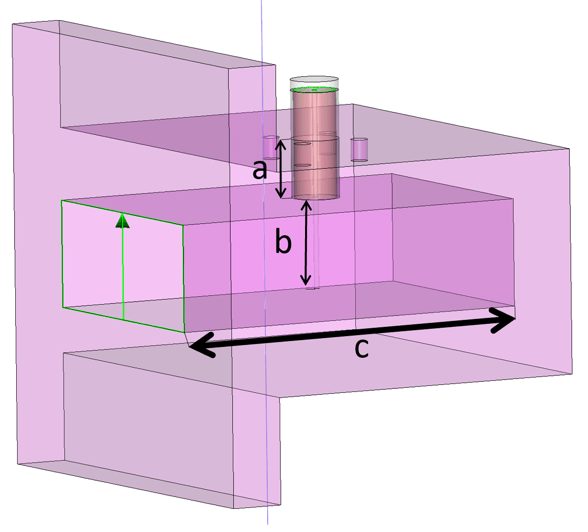 Основой оптимизационного анализа стала модель коаксиально-волноводного перехода, состоящего из волновода, центральной жилы и диэлектрика. Чтобы найти оптимальную конструкцию для центральной жилы было задано погружение вниз с сопутствующим перемещением диэлектрической опоры, а для волновода 一 перемещение задней грани.