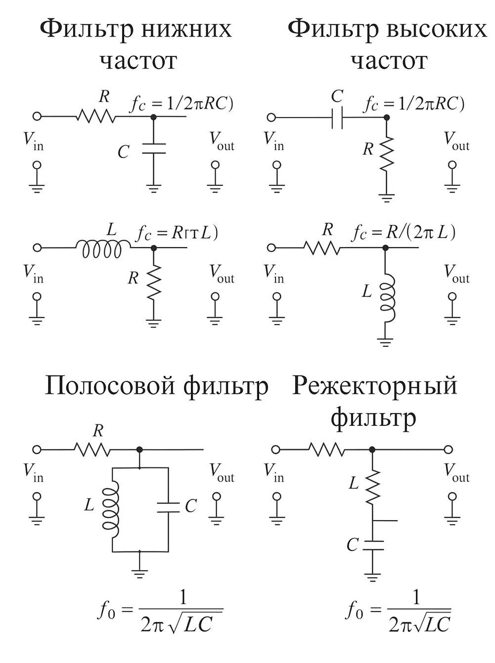 Фильтры основаны на реактивных элементах: резисторах (R), конденсаторах (C) и индуктивностях (L). Частотная селективность достигается за счёт того, что сопротивление этих компонентов зависит от частоты.