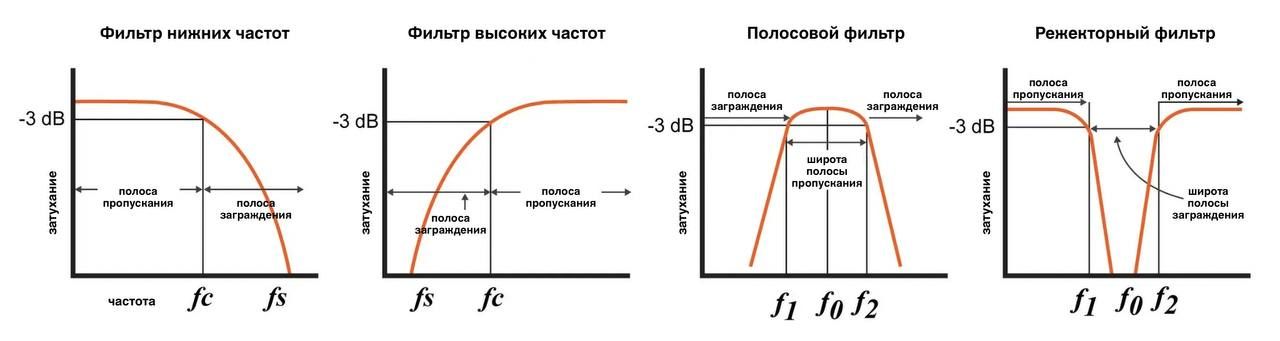 - Полосовой фильтр – пропускает только сигналы в заданной полосе частот, отсекая всё вне этой полосы